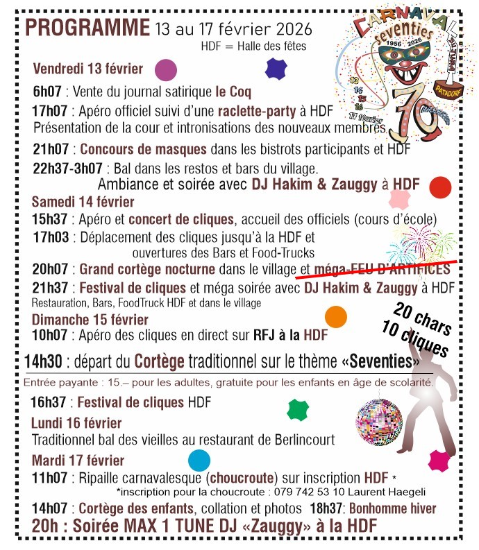 Découvrez le cortège nocturne du samedi soir (entrée libre) ainsi que le grand cortège humoristique du dimanche avec plus de 20 chars et 10 guggens, sans oublier le cortège des enfants le mardi après-midi